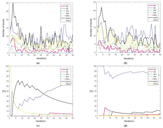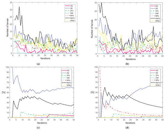 Regarding the computational performance of the CRO-SL in this problem, Figure 6a,b shows the number of larvae (potential solutions to the problem) getting into the reef per substrate, over the iterations. Note that a new individual can enter in the population on a random place, if its associated fitness value is better than the occupied one, or if the place is empty. Due to the initial hollows in the reef, in the first iterations of the algorithm’s run there is a higher probability to enter, independently of the quality of solutions, so this number is usually greater at the beginning of the algorithm’s run. In Figure 6c,d, the accumulative ratio of times that each substrate is producing the best larva is shown. It is remarkable that the best larva might not be better than the fittest coral of the reef. Regarding both figures, it can be pointed out that DE and NaFa substrates are good in search space exploration and exploitation. On the one side, they get into the reef a higher amount of larvae, which means, that they usually produce fitter individuals that the existed ones in the reef. It can be observed that GM does not show a good performance, as the solutions proposed by this method never fit in the reef. In addition, note that around 50% and 30% of the iterations these substrates, respectively, are producing the best larva in the linear model. Furthermore, in the nonlinear model DE substrate reaches the 80%. Other substrates such as HS, GM, MPx, or 2Px, are not producing fitted individuals because they are collaborating in a further exploration of the search space, instead of its exploitation.