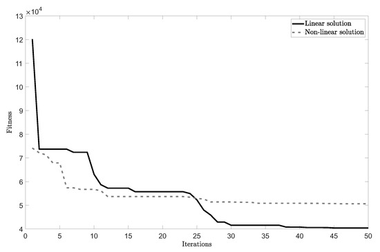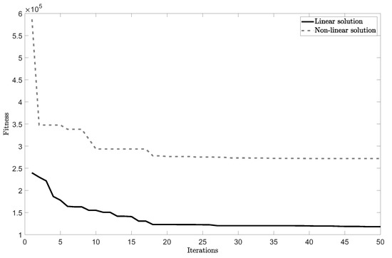 Figure 7 shows the fitness evolution for the linear and nonlinear cases. Note that the linear solution produces the lowest value of the functional, though it needs 37 iterations to be close of the final functional value.