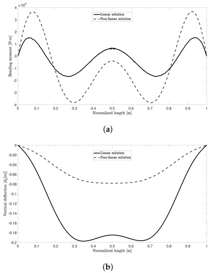Bending moment (a) and vertical deflection comparative (b) for linear (solid line) and nonlinear (dashed line) in the case in which the height B is fixed.