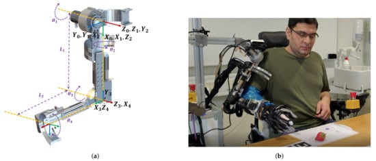 The kinematic model of the exoskeleton robot is developed by using Denavit–Hartenberg (DH) parameters defined in Table 1, where and represent the lengths of the upper arm and forearm links, respectively. Based on the DH parameters, the transformation matrix is given by