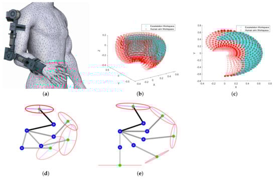 Workspace analysis of the 4-DOF upper limb exoskeleton (cyan) within the human arm workspace (red) (measured in meters): (a) human–exoskeleton system, (b) isotropic view of upper limb exoskeleton and human arm workspace, (c) sagittal plane view of upper limb exoskeleton and human arm workspace, (d) different configurations of human–exoskeleton system in high manipulability region, (e) configurations of human–exoskeleton system in low manipulability region.