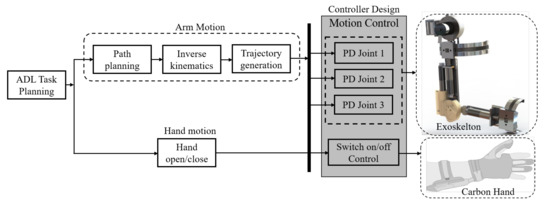 The control architecture for the upper limb exoskeleton and carbon hand is shown in Figure 3. The control system is implemented in the robotic operating system (ROS), which includes task planning for activities of daily living, a complete path planning for the robotic exoskeleton, computing the inverse kinematics, trajectory generation, and controller design. Furthermore, input control signals are used to perform an ADL while wearing the robotic exoskeleton and carbon hand.
