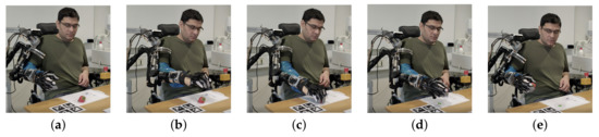 Demonstration of an object picking-up task: (a) initial position s, (b) moving over the target s, (c) exoskeleton moves to a grasping position and hold the object s, (d) pick the object up s, (e) get back to the initial position s.