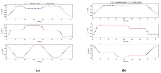 Exoskeleton’s trajectory tracking control performance assessment for two different ADL. (a) PD-based trajectory tracking controls for drinking task. (b) PD-based trajectory tracking control for an object picking-up task.
