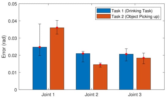 The robotic system and the control algorithms can be designed to fulfil the requirement for a particular task, but sometimes it is hard to achieve generality. Thus, to maximize the functional reliability of the presented system, we selected a second task to evaluate the system’s performance, shown in Figure 5. It is noted that the tracking performance of the shoulder joint was reduced, while the tracking accuracy of Joint 2 and Joint 3 was increased compared to the normal drinking task, shown in Figure 7. In general, the variation in the RMSE values among the 16 trials was in an acceptable range, i.e., 0.0079 rad, 0.0024 rad, and 0.0062 rad for all three joints.