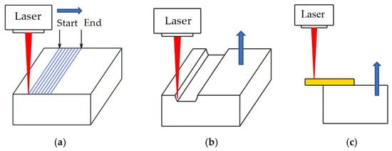 Martínez et al. [22] applied the laser hardening process with scanning optics to AISI 1045 steel. The scanner-based laser hardening process presented an inherent variation of the temperature due to the scan effect of the laser beam. The test results showed two different regimes, relatively smooth and rippled, depending on the scanning speed and feed rate values. Zimmermann et al. [23] studied laser machining for the preparation of cutting edges of cemented carbide inserts. The laser parameter settings applied for the preparation were varied, and the analysis reveals that the surface, the surface integrity and the tool performance are significantly affected by the parameter sets used for laser machining. The less heat dissipates from the processing area into the adjacent material, the more efficient the material removal, and the lower the surface roughness and the undesired alteration of the sub-surface properties.