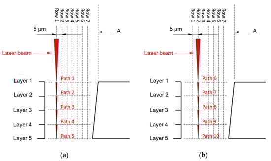 The processing paths are plotted as shown in Figure 3. The vertical direction along the Z-axis of the workpiece was processed first with 20 passes per path. After Layer 1 was processed, the workpiece stage was lifted by 100 µm in the Z-axis direction to process Layer 2. The total number of Z-axis lifts is 4 (5 layers in total). After processing all 5 layers in row 1, the stage was returned to its original position. The focal spot of the laser beam was shifted horizontally by 5 µm to the right to process the following path in layer 1 in row 2. The processing paths mentioned above were repeated until the number of horizontal shifts reach 6 (7 rows in total).