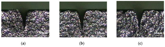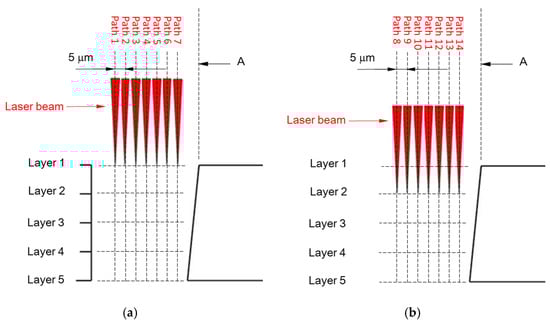 As shown in Figure 3a, the starting position of the laser finishing process was set at 48 µm to the left from the vertical baseline A. The location of baseline A was set at the vertex of the laser-cut upper edge. This starting position was calculated as half the laser spot diameter (18 µm) plus 6 horizontal shifts (30 µm). As a result, the laser beam was shifted 6 times to the right and the fringe of the laser focal spot will be in aligned with baseline A.
