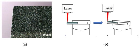 In this study, post cutting, the PCD workpiece comprised a tilted edge, as depicted in Figure 5a, and the finishing process described in Section 2.5 could not improve this result. This could be attributed to the accumulation of higher material volume removed from the upper layer compared to the lower layer. Furthermore, the bulk PCD material invariably shields the inner layers material by absorbing a significant portion of the incident laser energy. In order to reduce the tilting of the cut edge, this study used a single-axis curved stage (installed on the Z-axis positioning stage) to tilt the PCD workpiece at a defined angle, as shown in Figure 5b. The feasibility of the stage tilt and effect of applying/omitting it on the surface quality after laser finishing are discussed.