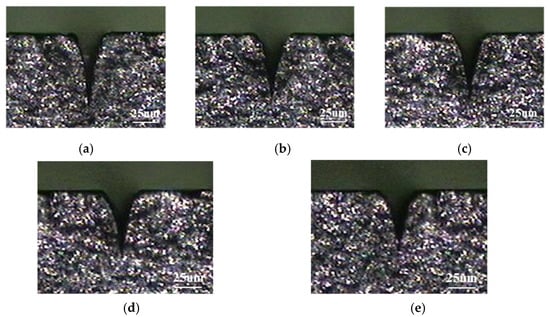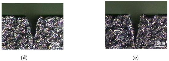 Optical microscope observation of the effect of variation in the scan rate on the kerf depth in laser cutting of PCD workpiece (laser processing parameters were set at average power of 25.5 W, pulse width of 200 ns, and repetition rate of 170 kHz): (a) scan rate of 1 mm/s; (b) scan rate of 3 mm/s; (c) scan rate of 5 mm/s; (d) scan rate of 7 mm/s; (e) scan rate of 9 mm/s.