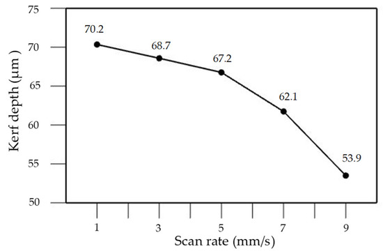 Relationship between scan rate and kerf depth (laser processing parameters are average power of 25.5 W, pulse width of 200 ns, and repetition rate of 170 kHz).