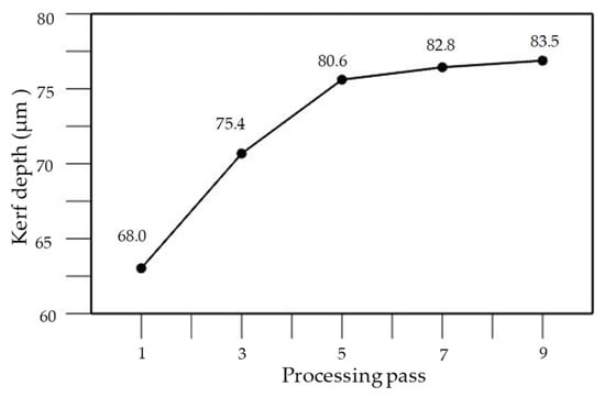Relationship between number of cutting passes and kerf depth (laser processing parameters were set at average power of 25.5 W, pulse width of 200 ns, and repetition rate of 170 kHz).