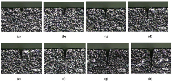 Effect of variation in pulse width on kerf depth in laser cutting of PCD workpiece. The fixed average power was 30 W, and the lowest pulse repetition rate for a specific kerf width was selected, as shown in Table 5. (a) Pulse width of 4 ns; (b) pulse width of 8 ns; (c) pulse width of 14 ns; (d) pulse width of 20 ns; (e) pulse width of 30 ns; (f) pulse width of 50 ns; (g) pulse width of 100 ns; (h) pulse width of 200 ns.