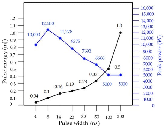 Correlation between variation in pulse width, pulse energy, and peak power. The pulse energy increases with an increase in pulse width. The maximum pulse width of 200 ns corresponds to the lowest peak power 5000 W.