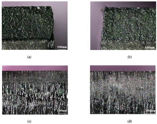 After the PCD workpiece was cut into two parts, the starting path side (left side, Figure 13a) and final path side (right side, Figure 13b) of the cut surface were observed by an optical microscope, as shown in Figure 13. A tilt of approximately 5.4° was observed on the final path, which appears smoother than the starting path, as shown in Figure 13b,d. On the contrary, the starting path appears very rough with numerous recasts; the surface quality of the starting path was much worse than that of the final path, as shown in Figure 13a,c. This phenomenon might be attributed to the repeated focusing of the laser beam energy on the right side wall, which creates a better surface quality of the cut workpiece.