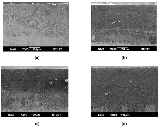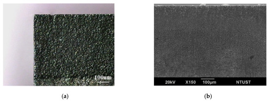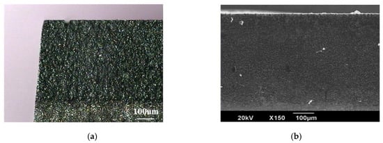 The optical microscope images reveal that the cut edge of the PCD workpiece is titled, as shown in Figure 16a. The titled angle of the laser finishing edge was measured at 5.2°. Although this value was slightly less than that of the laser cut edge, it was not sufficiently low. The titled edge angle was attributed to the layer-by-layer cutting and finishing process from the top of the workpiece to the bottom. The material on the upper layer was subjected to multi-processing, after which more material was removed. This is in agreement with the results of Hung and Chang [21] and Li et al. [27]. The other reason that led to the titled edge angle was the laser energy shielding effect, as the focal spot of the laser beam was located below the top surface of the workpiece. The laser energy was shielded, and the laser energy was decreased.