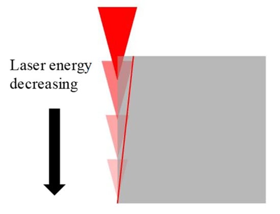 The results during the previous laser-cutting tests reveal that the final processing path depicted on the right (Figure 3 and Figure 4) yields superior surface quality. Therefore, this path was used for the laser-finishing tests using Methods 1, 2, and 3. To this end, the finishing paths depicted in Figure 3 and Figure 4 were considered. The surface morphologies of the finished surface obtained by these methods were investigated by scanning electron microscope (JSM-6390LV, JEOL), as shown in Figure 14. The images reveal that the recasts and deposits are removed; moreover, the best surface quality was obtained with Method 3. The inferior surface quality observed with Methods 1 and 2 might be due to the laser beam energy being shielded by the PCD bulk material located above the laser beam focal spot, as shown in Figure 15. The shielding of the laser beam energy increases with processing depth. Thus, the deepest part is subjected to the lowest laser energy, thereby resulting in the incomplete removal of recasts and sidewall deposits as well as inferior surface quality.