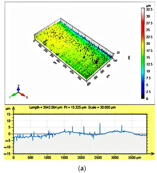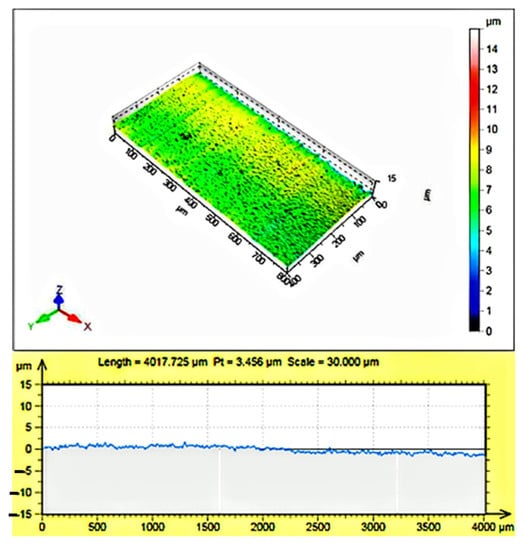 To achieve the target finishing depth of the PCD workpiece, pulse width of 200 ns and pulse repetition rate of 30 kHz were used for the laser-finishing test conducted with Method 3. The test results are shown in Figure 16. No significant difference in the surface quality was observed between high pulse width of 200 ns and low pulse width of 50 ns, as shown in Figure 14d and Figure 16b, respectively. The surface roughness of the finished surface of the PCD workpiece was measured by coherence correlation interferometry (CCI; Talysurf CCI-Lite, Taylor Hobson, West Chicago, IL, USA), as shown in Figure 17. The surface roughness before finishing was Ra = 0.378 µm, and that after finishing was Ra = 0.209 µm. The laser cut surface showed a flat morphology. The findings of this study reveal the realization of improved surface morphology and roughness after laser finishing of the PCD workpiece. This results in superior surface quality of the cut surface. These results demonstrate good agreement with those reported by Kamlage et al. [20].