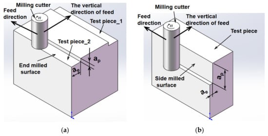 The experimental material was a 7075-T7451 aluminum alloy pre-stretched plate. To save the time of preparing the test pieces, a type of test piece with 100 mm × 80 mm × 40 mm was cut out from the plate for an end milling experiment. A total of five test pieces were milled by the bottom edge of an end mill. Each test piece was subjected to two milling experiments with two sets of milling parameters. Each milling experiment was also performed at a different position of the test piece. Another type of test piece with a size of 100 mm × 40 mm × 40 mm was prepared for the side milling experiment, i.e., milling with the circumferential edge of an end mill. There were nine test pieces in total, and each test piece was only subjected to a milling experiment with one set of milling parameters. The two milling methods are shown in Figure 1.