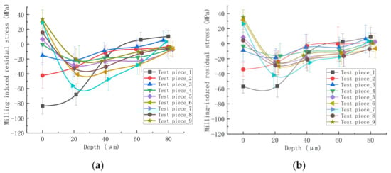 The residual stress distribution along the depth direction in the test piece surface of end milling: (a) the residual stress distribution in the feed direction; (b) the residual stress distribution in the vertical direction of feed.