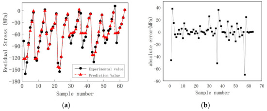 To investigate the performance of the formulated neural network, we implemented predictions based on the training data and observe the errors of the prediction model. The prediction results are shown in Figure 5. The results show that the prediction results obtained from the BP neural network are not ideal. The error on several samples is significant, and the absolute error exceeds 20 MPa. It is because the BP neural network may converge to a local minimum.