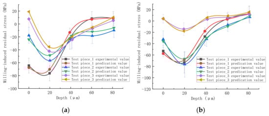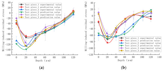 To verify the accuracy of the residual stress prediction model, six groups of data were re-selected for the milling experiment, three groups for end milling and three groups for side milling. The experimental parameters are listed in Table 10 and Table 11, and the results are shown in Figure 7, Figure 8 and Figure 9. Figure 7 and Figure 8 show that the residual stress distribution curve obtained by the prediction model is consistent with the curve measured by the experiment. Figure 9 presents that the residual stress prediction absolute error of end milling is between 0.24–13.30 MPa, and that of side milling is between 0.23–11.34 MPa. The prediction error is in the same order of magnitude (i.e., ±10 MPa) as the measurement accuracy of the residual stress analyzer used. Therefore, the proposed prediction model of milling-induced residual stress is accurate.