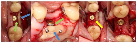 Clinical procedure of the tooth shell technique. (a,b) Occlusal and lateral view: Inserted implant at the site of tooth 36. The vestibular bone deficit is shown by the green arrows. Dentin shell fixed with osteosynthesis screws to the vestibular aspect of the implant (blue arrows). (c) The hollow space created between the dentin shell and implant was filled with particulate dentin (yellow arrow). (d) Occlusal view at the time of implant exposure with removed osteosynthesis screws. The implant seems to be fully osseointegrated with a stable laterad ridge lateral augmentation.