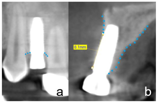 CBCTs after implant exposure. Dotted lines trace the outline of the alveolar ridge. (a) No horizontal bone loss at the mesial and distal implant shoulder is detectable at the time of implant exposure. (b) Measurement at the time of implant exposure from the implant shoulder to the first implant/hard tissue bone contact. In this case, 8.1 mm of the buccal lamella bone was completely resorbed.