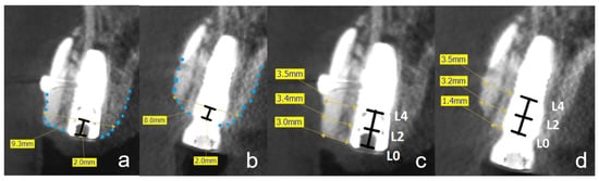 The radiographic evaluation included the assessment of the approximal peri-implant bone level, the thickness and integrity of the buccal lamella, and the crestal width. For evaluation of the approximal peri-implant bone level, the distance between the implant shoulder and the first implant–bone contact was measured at time T2 in a mesiodistally aligned plane as in a 2D radiographic assessment, assuming that the implant was placed at the hard tissue level at T1 (Figure 3a). Only the highest value at the mesial or distal margin was included in the analyses. The integrity of the buccal lamella was assessed in a bucco-palatal aligned plane as shown in Figure 3b at time T2. If implant surfaces were detected that were not covered by a radio-opaque structure, the distance between the implant shoulder and the first implant/bone contact was measured (Figure 3b). The thickness of the buccal lamella was evaluated orthogonally to the implant axis at the level of the implant shoulder (=L0), as well as 2 mm (=L2) and 4 mm (=L4) below the implant shoulder at T1 and T2. The width of the alveolar crest was measured 2 mm below the implant shoulder in the same plane at T1 and T2. This method of measurement using CBCT of lateral ridge augmentation has been applied in previous studies [22,30,31].