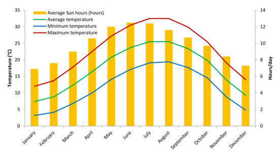 There are different climate zones in Jordan. Some zones are like the Mediterranean climate, and the others are almost like the desert climate. The Jordanian weather is characterized by four distinct seasons, where autumn and spring are the ideal human comfort range. The capital of Jordan, Amman, is classified as sub-humid Mediterranean. The sub-humid Mediterranean climate is characterized by hot, dry summers and rainy winters. This climate has an average temperature of around 3 °C in the coolest winter months. It has a dry summer month with average temperature in the warmest month reaching up to 34 °C, and the sun hours range from 7 h in the winter months and up to 13 h in the summer months [29] as shown in Figure 1.