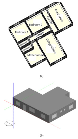 The schematic design of the house (a) building layout, (b) 3D building model.