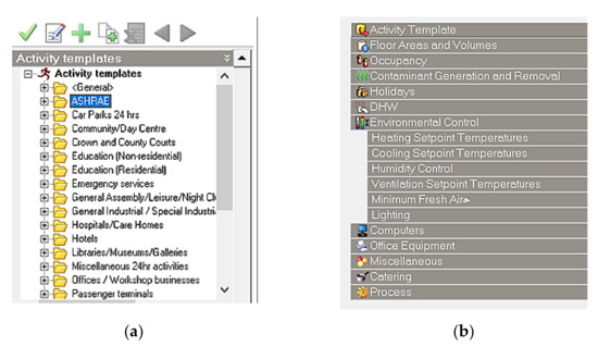 Modeling the building’s geometry in the environment of DesignBuilder. (a) Activity templates; (b) building simulation parameters.