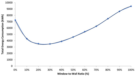 The following equation (Equation (1)) represents the relation between total building energy consumption (kWh) with different WWR (x):