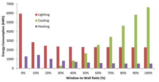 Optimization of WWR offers a balanced solution to the contradictions involved in selecting an appropriate WWR in future building design to sustain occupants’ thermal comfort with the least amount of heating, cooling, and lighting energy. Although increasing the efficiency of active technologies impacts the passive approaches used in buildings, for future sustainable building design, it is essential to find the optimal WWR for minimizing cooling and heating loads, as well as ensuring an appropriate level of lighting.