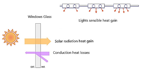 In general, the building gains heat through lights and solar radiation penetrating into the building through the glass, and the building lose some of the heat through the glass by conduction heat losses, as illustrated in Figure 7.