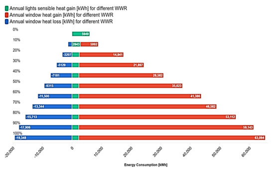 Increasing WWR from 0% to 10% saves around 41% of the total energy consumption; increasing WWR from 10% to 20% saves around 18%; followed by almost 1% when increasing WWR from 20% to 30%; and afterward, an increase in the total energy consumption by 11%; on average, 18% for each 10% increment in WWR.
