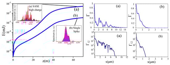 On the left, the growth along the undulator is presented for (a) high (50 pC) and (b) low (8 pC) charge cases. Saturation is reached in about 50 m with a level of (a)  and (b)  photons/pulse, respectively. The spectral profiles are reported in the inner boxes, showing the SASE fluctuations in the high charge case (a) and the single spike mode in the low charge one (b). The coherence degree, evaluated from the correlation,