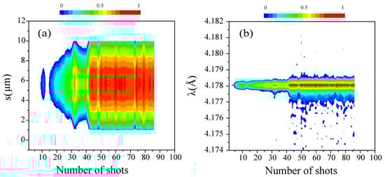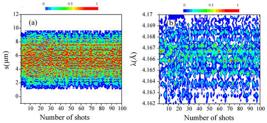 between two different generic pulses or for one single pulse (), is shown in the windows on the right part of Figure 1. In expression (2),  and  are the complex electric fields of the pulses as a function of time. In the SASE mode (case (a)), phase coherence on one single pulse and shot-to-shot stability are poor, with a coherence length less than 1 m over a 10 m long pulse and an equal time coherence degree () of about . In the single spike mode (case (b)), the coherence length coincides with the pulse’s, but the shot-to-shot stability is low, with . The characteristics of the SASE radiation are summarized in Table 2, in the third (high charge working point) and fourth (single spike mode) columns. The patterns of the SASE power (a) and spectral distribution (b) are shown in Figure 2 as a function of the number of shots. From this graph, the modest size of the coherence areas and the poor stability of the SASE process are evident.