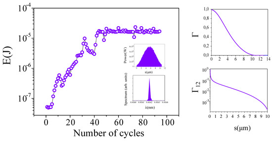 Jitters occur due to the different microscopic structures of the successive electron bunches. In the inner boxes, the temporal and spectral distributions at saturation are presented. The right windows of Figure 5 show the auto () and mutual () coherence degrees of the XFEL-Oscillator, pointing out its enhanced coherence and stability with respect to the SASE’s reported in Figure 1.