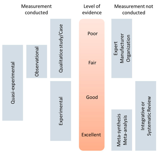 The right side of the diagram (Figure 2), deals with nonsystematic, systematic, and mixed methodology papers. The nonsystematic refers to studies from manufacturers or consultants, including experts’ opinions and guidelines of professional organizations and standards. The scientific robustness of the papers is lacking and the critical approach to the investigations is missing. Furthermore, these studies might have financial interest bias. These nonsystematic papers are all rated as poor. In contrast to this, the systematic reviews and meta-analyses identify, evaluate, and summarize objective and accurate approaches rated as excellent evidence. Meanwhile, in the systematic review and the integrative review with lower quality of study design, the studies summarize merely empirical or theoretical views, therefore they reach a fair level.