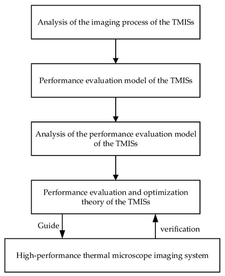 In this paper, we studied the performance evaluation and optimization theory of TMISs. The thermal microscope imaging process was analyzed, and the performance evaluation model suitable for TMISs was further deduced and established. Based on the performance evaluation theory, we conducted simulation analysis and obtained theoretical results suitable for performance evaluation and optimization of TMISs. Finally, guided by the theoretical analysis results, we built a high-performance thermal microscope imaging system and carried out the system’s image acquisition experiment. The experimental results show that the designed system has high performance, which proves that the theory studied in this paper could provide a theoretical basis for the TMISs design. The block diagram of the research in this paper is shown in Figure 3.
