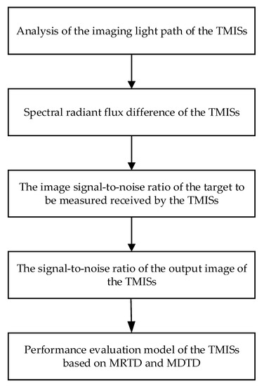 We analyzed the difference in spectral radiant flux between thermal microscope imaging and telephoto thermal imaging. The expression for the SNR (signal-to-noise ratio) of the output image of the TMISs was derived, based on the analysis of the characteristics of thermal microscope imaging, and we propose novel MRTD and MDTD models that are suitable for evaluating the performance of the TMISs. The block diagram of the research method in this paper is shown in Figure 4.