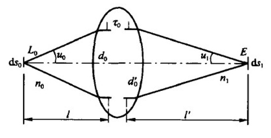 In the TMISs, the light radiated by the microfacet of the object to be measured is received by the optical system in a divergent form, and then passes through the optical system focus on the imaging detector. The imaging optical path diagram of the TMISs is shown in Figure 5. Among them, and represent the microfacets of the object to be measured and the detector respectively, and represent the refractive index of the object space and image space respectively, and respectively represent the opening angle of the micro-unit of the object to be measured and the micro-unit of the detector of the optical system, and represent object distance and image distance, respectively, represents the spectral transmittance of the optical system, and represent the diameter of the optical system in object space and image space, respectively. The radiant flux emitted by the micro-space element in object space to a lens with an aperture can be expressed as [30]