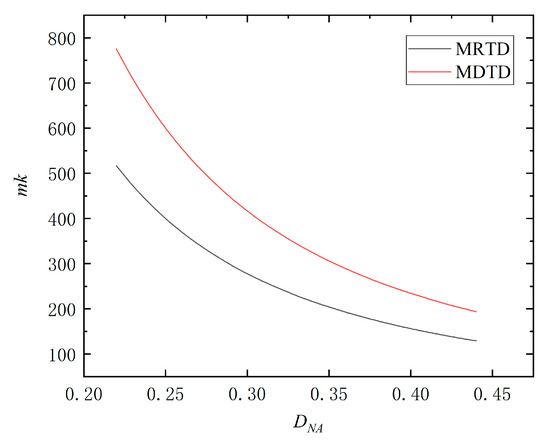 according to Equations (33) and (35), the changes of MRTD and MDTD of the TMISs concerning DNA can be analyzed. For example, using an uncooled focal plane detector imaging device with MRTD’ = 100 mK (F = 1) and MDTD’ = 150 mK (F = 1) in telephoto mode, if the difference in objective transmittance is ignored, the MRTD-DNA and MDTD-DNA curves of the TMISs can be obtained, as shown in Figure 6.