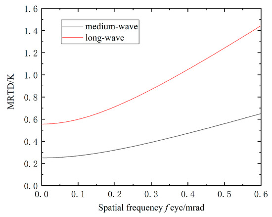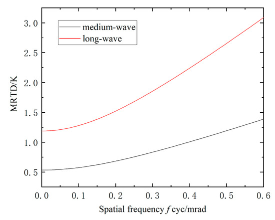 Both Figure 9 and Figure 10 show that the expressions of MRTD about f and are monotonically increasing functions. As the spatial frequency f and background temperature increase, MRTD also tends to increase monotonically. The temperature resolution ability of ITD under the medium-wave is better than the long-wave. For example, when the spatial frequency , the MRTD of the ITD in the long-wave and medium-wave are1520.7 mK and 682.9 mK. When = 300 K, the MRTD of the ITD in the long-wave and medium-wave are 1617.8 mK and 721.3 mK.