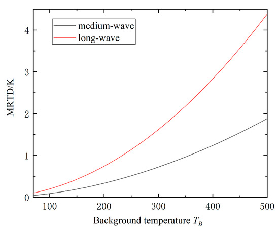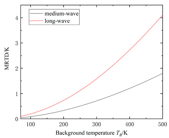 As shown in Figure 8, the MRTD increases with increasing background temperature, indicating that even under the condition of constant spatial frequency the increase of the background temperature will also increase the MRTD, resulting in a decrease in the temperature resolution of the system, meaning that for targets with a certain temperature difference, the higher the background temperature, the harder it is to be discriminated. From the above analysis of Figure 8, we find that to make the system have better performance, besides optimizing the system from the perspective of detector type, band selection, and optical design, the operating environment temperature of the system is also an important factor, and based on the newly established MRTD model, we can choose appropriate background temperature for different types of systems.