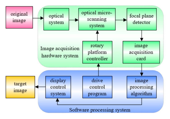 Finally, the sub-pixel imaging technology based on optical micro-scanning can improve the temperature resolution of the imaging system by reducing the imaging frame rate [34]. Therefore, we have designed a 2 × 2 micro-scanning system, and built a new type of micro-scanning thermal microscope imaging system, as shown in Figure 11. This system consists of an infrared magnifying objective (Magnification: 2), a micro-scanner (Model: GIP-101, micro scan step size: 4.5 pixel size), an infrared image acquisition card (Model: Tau2-324), an image processing system (Computer name: LAPTOP-7DJSLF4O), and a power supply (220 V), as shown in the block diagram of a high-resolution thermal microscope imaging system in Figure 12 [35,36,37].