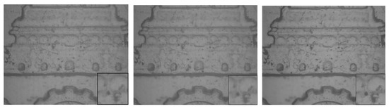 After completing the construction of the system, we carried out the system acquisition image experiment; Figure 13 shows the experimental results. Figure 13a is the low-resolution thermal microscope image collected by the system. This is resized using bilinear interpolation, as shown in Figure 13b. Figure 13c is the micro-scan reconstructed image collected by the system, which is obtained by interpolating the four low-resolution images collected by the system according to the 2 × 2 micro-scan [37]. Since the ideal high-resolution image cannot be obtained in this experiment, instead we provide the image information entropy (SNT) for assessment [38,39].