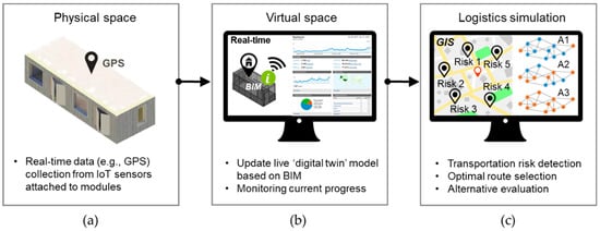 Despite its promising potential for supply chain management, existing digital twin research is mainly found in the contexts of product operation and shop floor management [13,14]. There is thus untapped potential for using a digital twin for logistics, the process in which modules are produced in a factory, stored in a warehouse, and then delivered—one key component of supply chain management in modular construction. Recently, studies have indicated that a digital twin could enable efficient logistics management, but their application has been limited to logistics in factories and warehouses [9,15,16]. There is still a lack of knowledge about the digital twin’s practical application in logistics for construction projects where materials are delivered from offsite to onsite through transportation. Many logistical uncertainties and risks have thus not been addressed, posing a major barrier to the widespread application of modular construction.