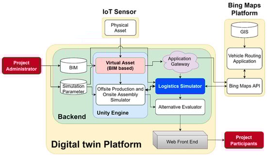 The suggested digital twin framework’s system architecture is shown in Figure 2. The system architecture shows the overall outline of the system and its data transaction flow in detail; it also shows how data analytics for logistics simulation can be performed without combining BIM and GIS in one data format.